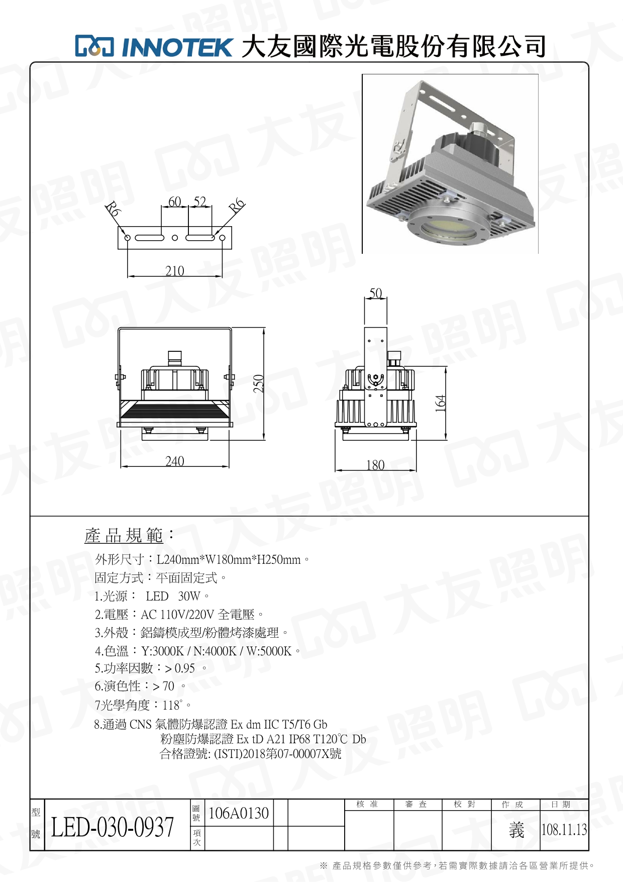 ˙電源多重保護裝置設計,安全,壽命長˙COB封裝,專利快速導熱系統,散熱快、高光效、低光衰˙客製化不鏽鋼轉接頭,可搭配 1/2~3/4 NPT內外牙防爆接頭˙瞬間啟動,無閃爍,省電,耐久性˙燈具鋁合金及不鏽鋼設計,耐腐蝕。